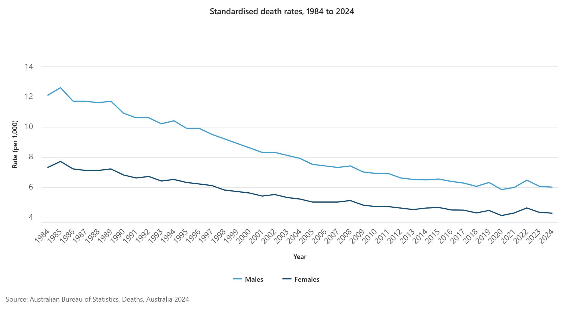 This chart directly from the ABS shows that the age-adjusted SDR has consistently declined over the past 40 years, though the rate of decline has slowed (you can also see the 2022 blip from COVID). Males still die at a faster rate than females but the gap is closing, with male death rates declining faster.